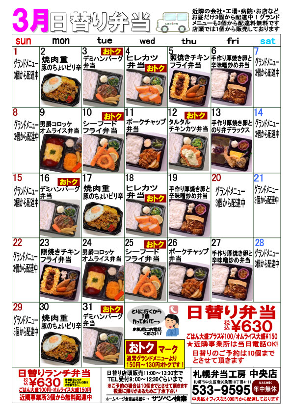 ★中央店3月の日替り弁当です。